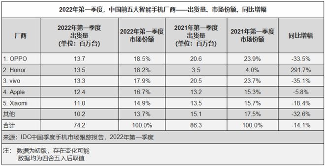 IDC手机季度跟踪报告显示,2022年第一季度,中国智能手机市场出货量约7,420万台,同比下降14.1%。IDC方面表示,持续的疫情反弹对消费者预算的影响,以及新产品升级幅度小等因素,导致了市场需求持续低迷,而更加不明朗的海外市场前景,令众多手机厂商开始采取更加稳健保守的运营策略,全年市场将迎来巨大挑战。