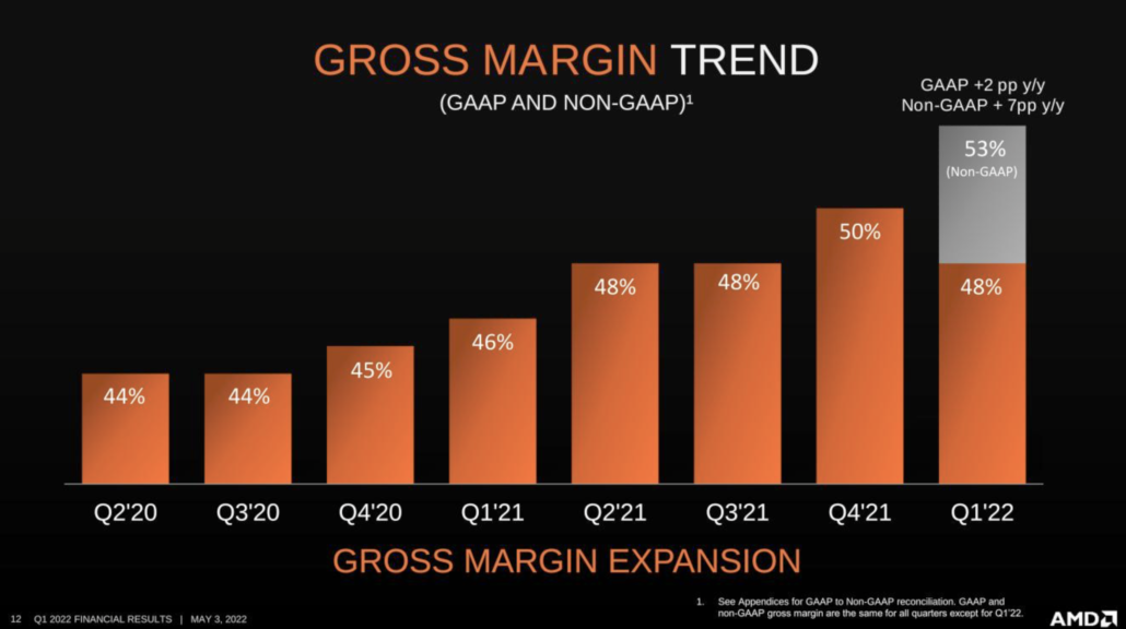 除去最近收购的赛灵思(Xilinx)的业绩,AMD第一季度不按照美国通用会计准则的调整后毛利率为51%,与上年同期的46%相比上升480个基点,与上一季度的50%相比上升60个基点。