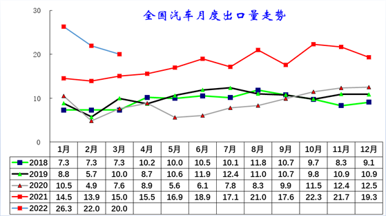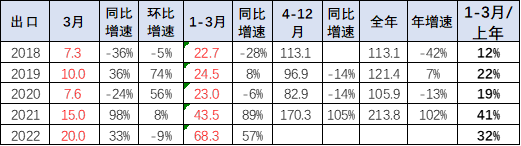 自 2020 年以来,随着世界新冠疫情的爆发,中国汽车产业链的韧性较强的优势充分体现,中国汽车出口市场近两年表现超强增长。2021 年的出口市场销量 213.8 万台,同比增长 102%;2022 年 1-3 月的出口市场销量 68.8 万台,同比增长 57%。