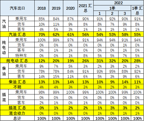 2022 年的中国汽车出口保持强势,其中汽油车的出口在 1 月表现很好,2-3 月持续下降,纯电动的 3 月出口下降较大。