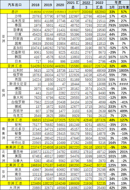 随着汽车独资企业的出口,中国汽车出口欧洲发达国家市场取得巨大突破。新能源车是中国汽车出口的核心增长点,改变了依赖亚洲和非洲等部分穷国和不规范国家的汽车出口被动局面。2020 年新能源车出口 22.3 万,表现好;2021 年新能源车出口 58.8 万台,继续持续走强;2022 年 1-3 月出口 20 万台新能源车,继续保持新能源车强势增长的良好局面。