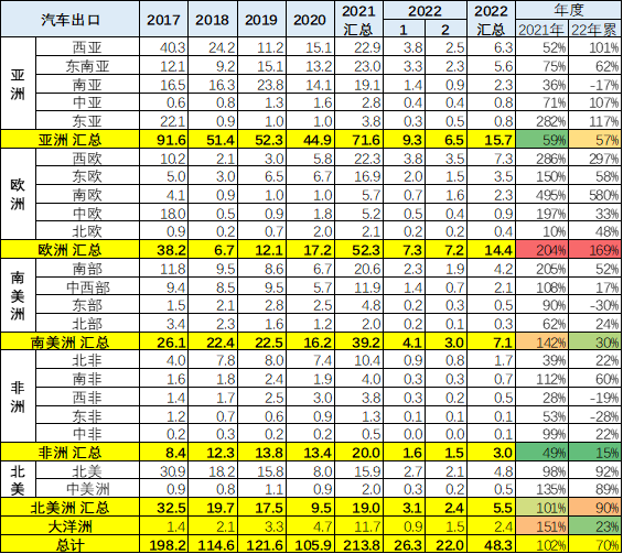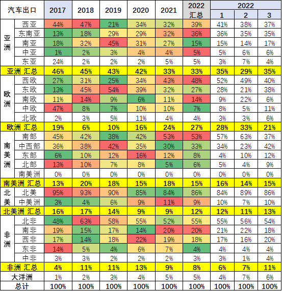 汽车出口的主力地区是亚洲和欧洲地区,目前发达地区走势超强。贫困地区亚洲出口走弱,非洲表现一般。