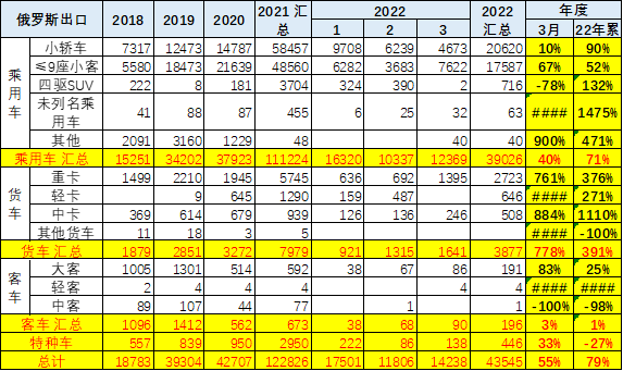 3 月的中国汽车对俄罗斯的出口 14238 台,达到了增长 55% 的高水平,其中重卡的出口增长了 761%,表现很强。