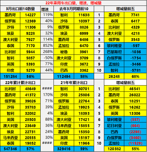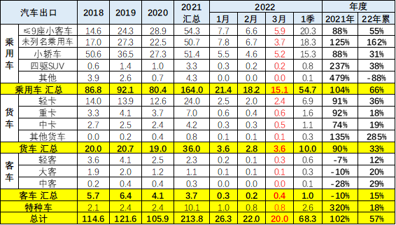 2022 年 1-3 月份中国汽车对俄罗斯汽车出口又达到 4.35 万台的规模,增长达到 79%,表现极强。今年对俄罗斯的出口主要是乘用车的出口增长较强,达到 39000 台水平,同比增长 71%。
