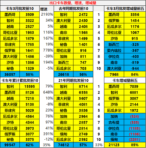 2022 年下滑的是缅甸、南非、加纳、伊拉克等市场。南美市场相对较好,其中智利、厄瓜多尔、墨西哥市场是中国卡车出口的核心主力市场。