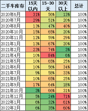 过去几年二手车的库存总体来看,处于 15 到 30 天的库存为主的特征。从去年年末缺芯以来 30 天以上的库存占到 60% 左右的比例,而 15 天以内的库存相对占比是比较小的。近期 30 天以上的库存是相对比较高的,这段时间因为行业缺芯,又由于去年底到今年 30 天以上的库存占比相对增加比较多,增加了整个二手车经销商的经营的压力,体现了整个二手车的流转速度在相对放缓的特征。