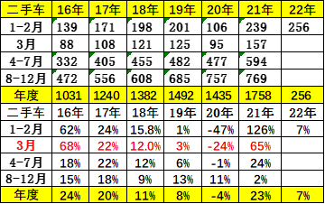近几年国内二手车市场呈现蓬勃发展的良好态势,尤其是在国家鼓励二手车流转的政策推动之下,二手车的交易环境日益的改善,交易数量大幅的提升。从 2016 年的 1000 万台水平到 2021 年的 1758 万台水平,持续大幅增长,只有 2020 年出现小幅的下滑,但 2021 年又出现了超强增长态势,熨平了强势增长态势。2022 年二手车仍处于蓬勃发展的良好的态势,表现是相对较强的。