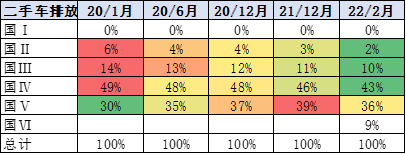 随着国五及以上排放标准的车型逐步进入置换期,其二手车市场中占比明显提升。2021 年国五及以上占比 38.7%,较去年提升 2%;国三、国四、国五排放的二手车异地交易比重基本维持稳定,全国异地交易比重的提升主要是国四及以上车型交易的比重逐步提升带动的,随着国六标准车型逐步进入二手车市场,对全国异地交易比重的提升效用逐步显现。
