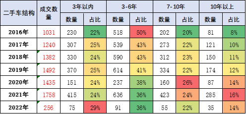 2021 年以来的短车龄车源补充缓慢,尤其是 0-3 年车龄的车源与 2020 年相比并未增加,7-10 年减少,而 10 年以上车龄增速较高;在长车龄车源逐步提升成为常态的背景下,优质车源的获取难度相对提升,竞争激烈。