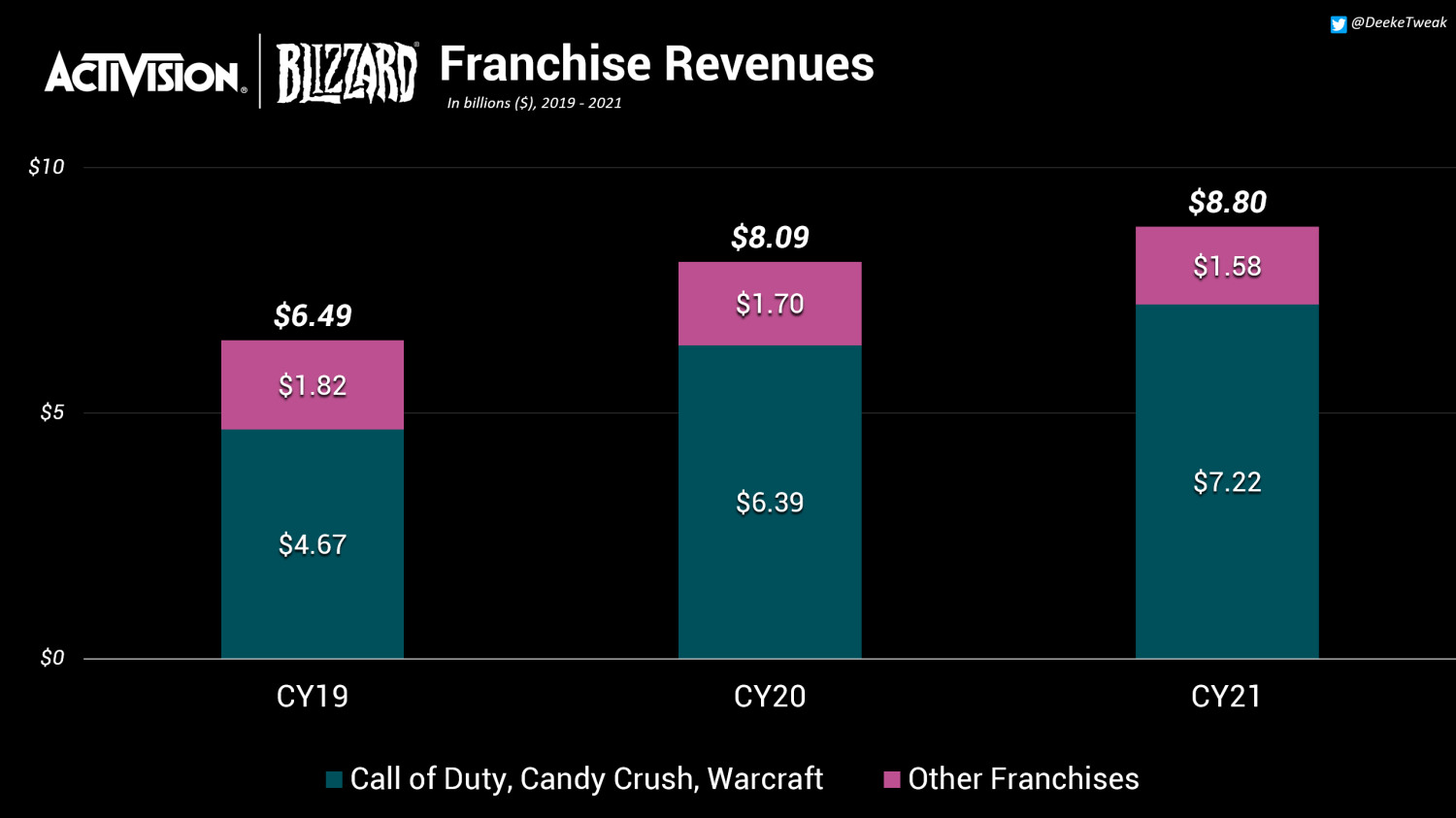 动视暴雪在2021年度报告中写道:“截至2021年、2020年和2019年12月31日的年份,我们的三大顶尖系列——《使命召唤》《糖果粉碎传奇》和《魔兽》一起分别占据了82%,79%和72%的净收入。在这三年中,没有其他系列占本公司净收入的10%或以上。”