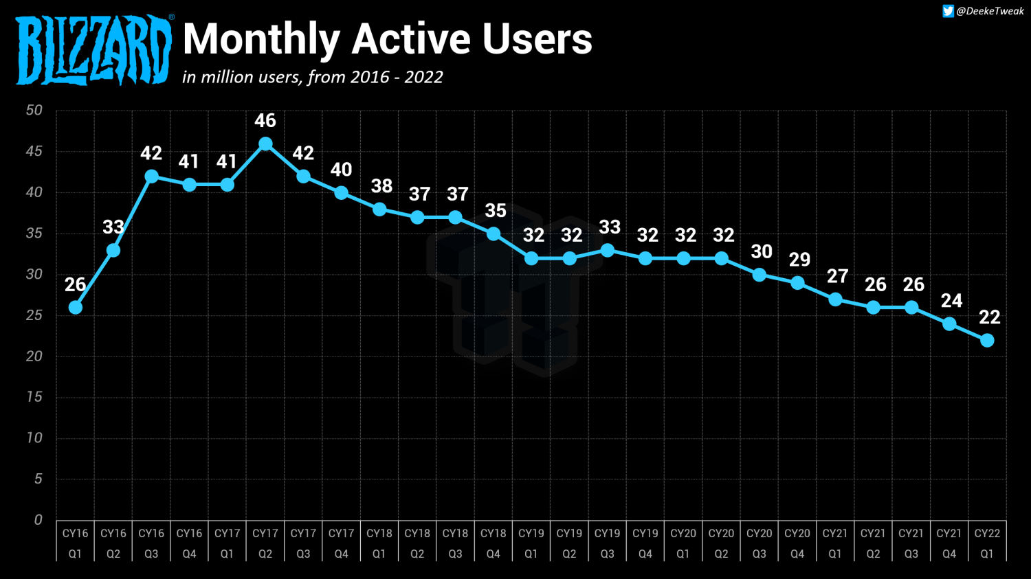 这个新闻的背景是暴雪月活用户来到2016年以来最低水平,2022年第一季度只有2200万。另外暴雪的收入也是有史以来最低的,2022年第一季度只有2.74亿美元。