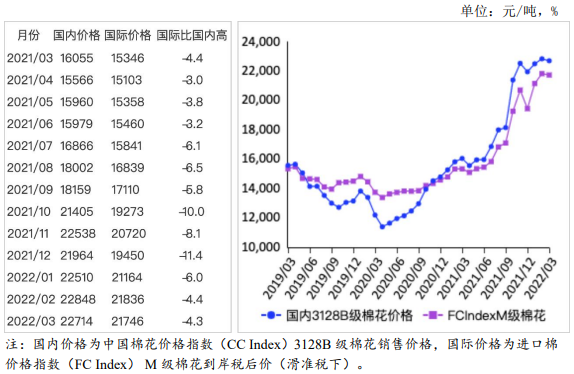 (二) 国际棉价持平略涨。本月,美国西部及西南棉区旱情引发市场对新年度美棉播种面积和产量的担忧,叠加美棉签约出口数据良好、国际原油价格上涨等多重因素,洲际交易所 (ICE) 棉花期货价格大幅上涨,3 月 25 日 ICE 棉花期货 5 月合约结算价涨至每磅 135.90 美分,创近 10 年最高水平。国际棉花现货价格跟涨。3 月份,CotlookA 指数 (相当于国内 3128B 级棉花) 月均价每磅 139.00 美分,环比涨 0.2%,同比涨 50.9%。
