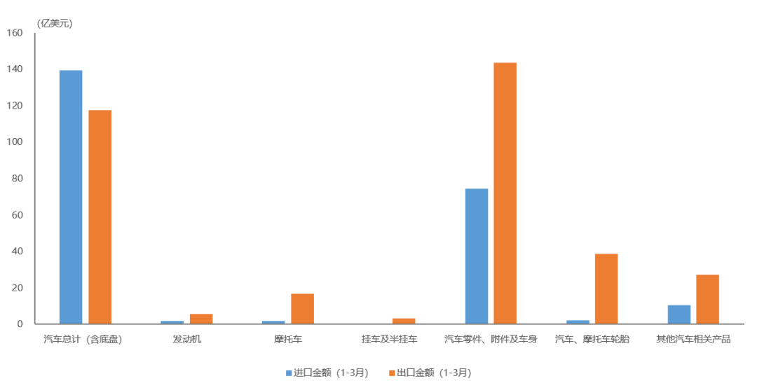 2022 年 1-3 月,全国汽车商品累计进出口总额为 582.4 亿美元,同比增长 12.8%。其中进口金额 230 亿美元,同比下降 3.1%;出口金额 352.4 亿美元,同比增长 26.4%。