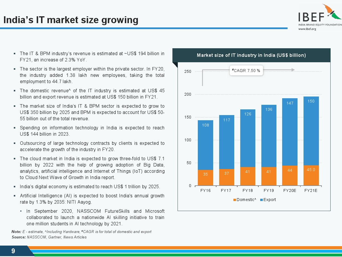 根据印度全国软件和服务公司协会 (Nasscom) 的数据,印度 IT 行业的收入预计在 2021 财年达到 1940 亿美元,同比增长 2.3%。