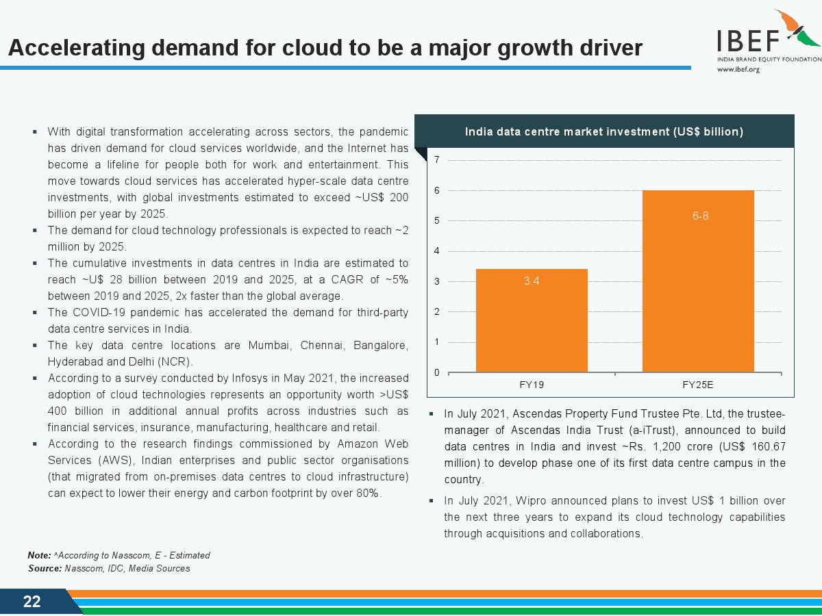 这种对云服务的需求推动了超大规模数据中心的投资。到 2025 年,全球投资估计每年将超过约 2000 亿美元。印度预计将在全球市场上获得重要份额,到2025 年该国的投资预计将达到每年约50 亿美元。