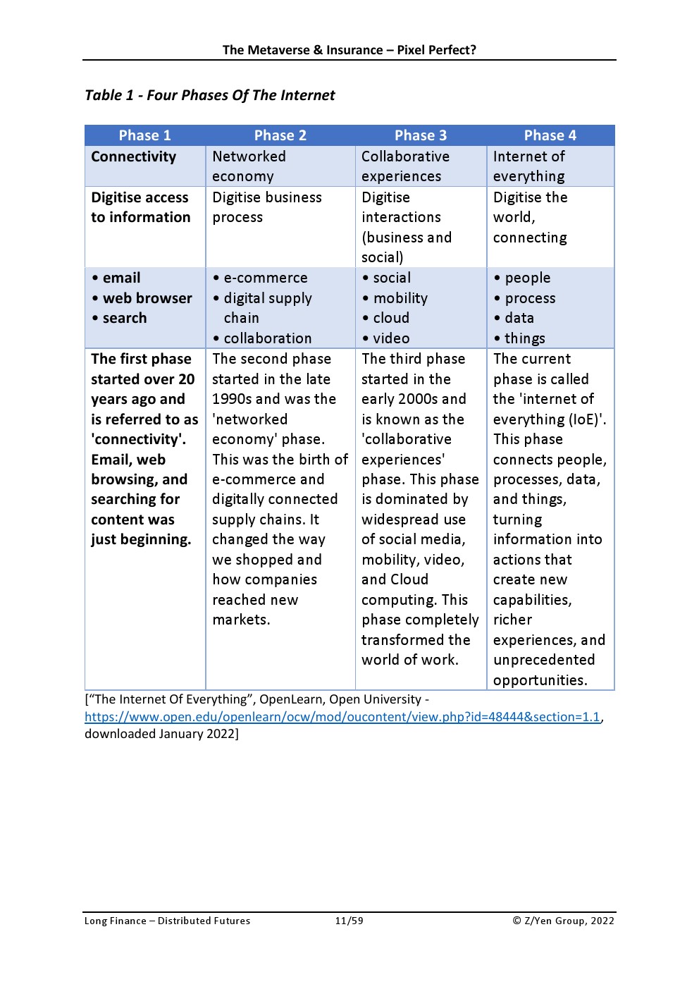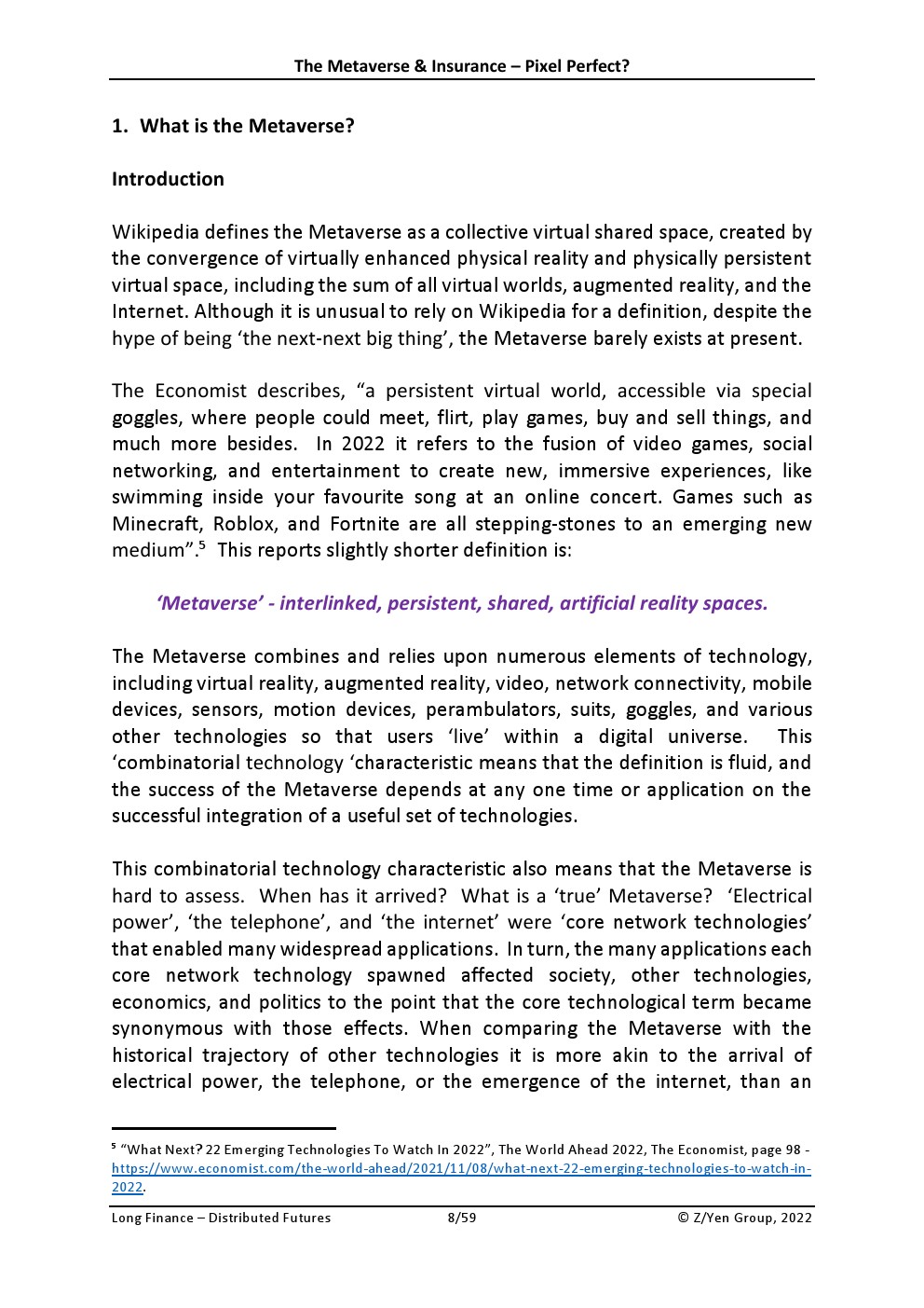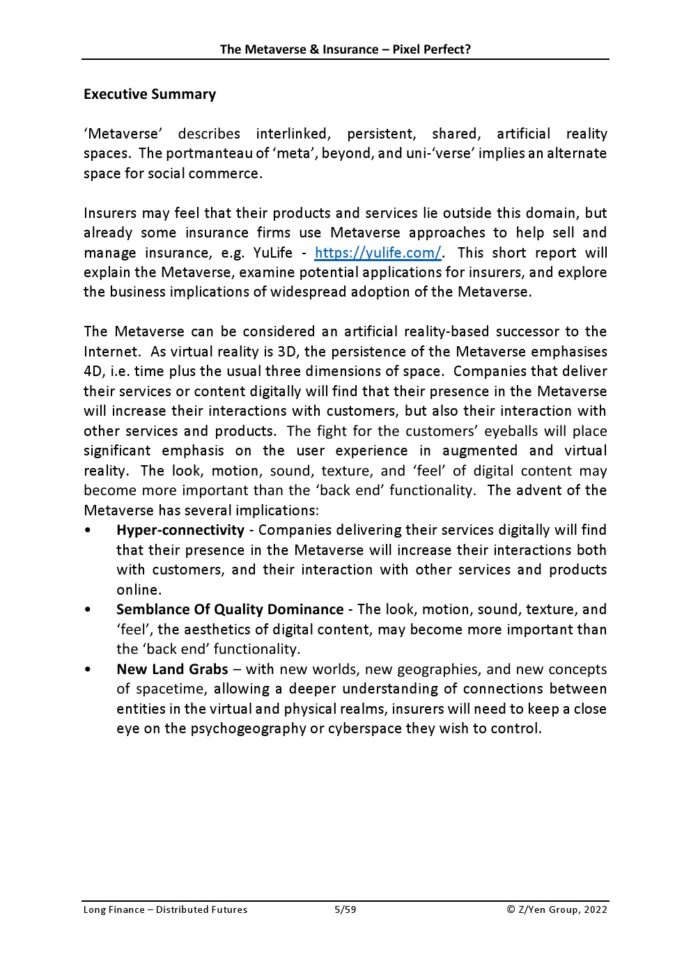 ZYEN发布了新报告“元宇宙与保险业”。“元宇宙”描述了相互关联、持久、共享的人造现实空间。 元宇宙包括有几个特征:超连接、以质取胜的外表和新的时空观念。它是一种进化技术,而不是一种革命性技术。元宇宙的普及将带来诸多挑战、风险和机遇。