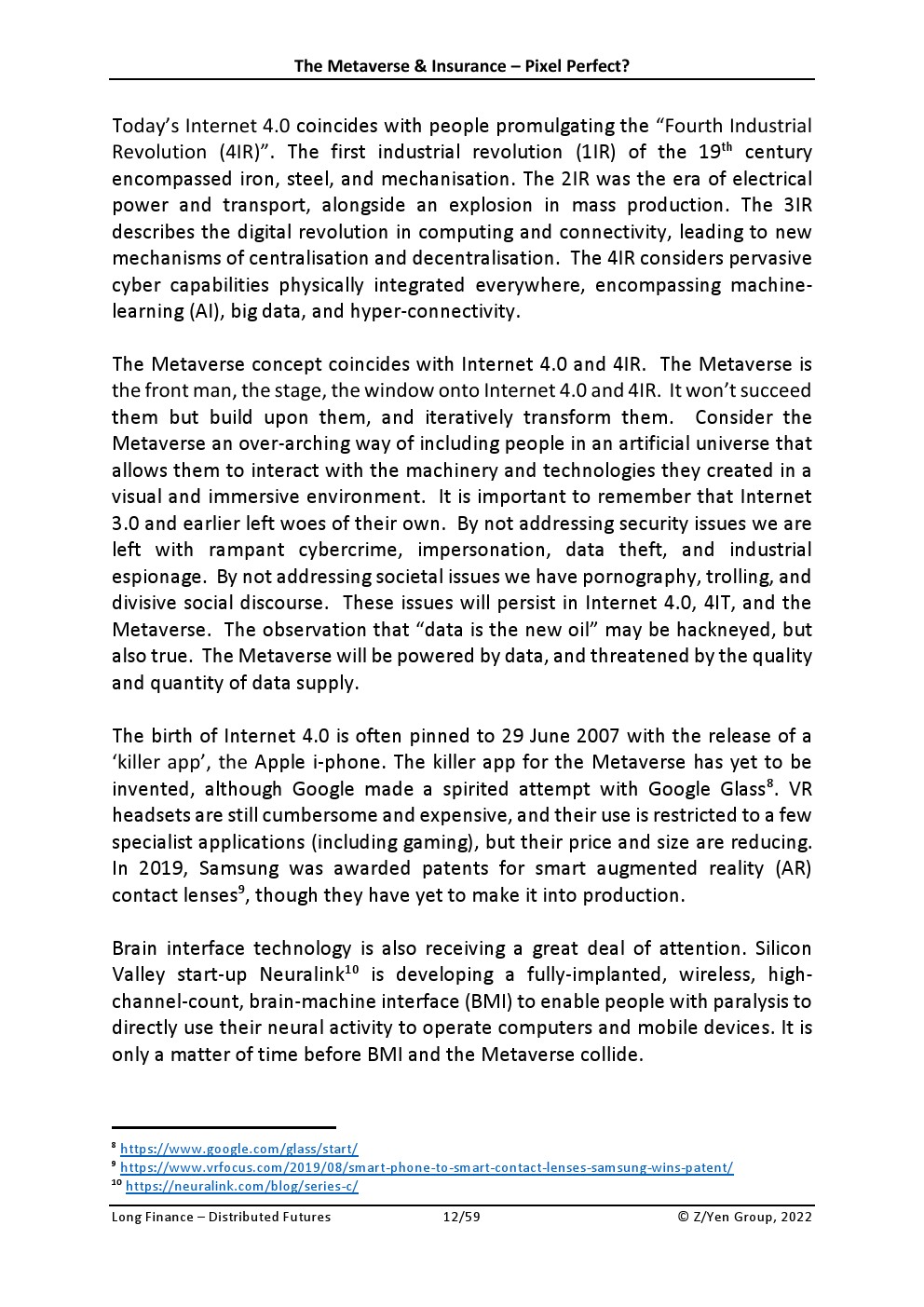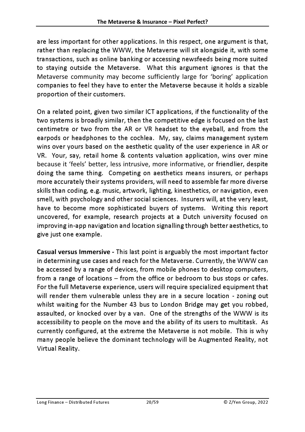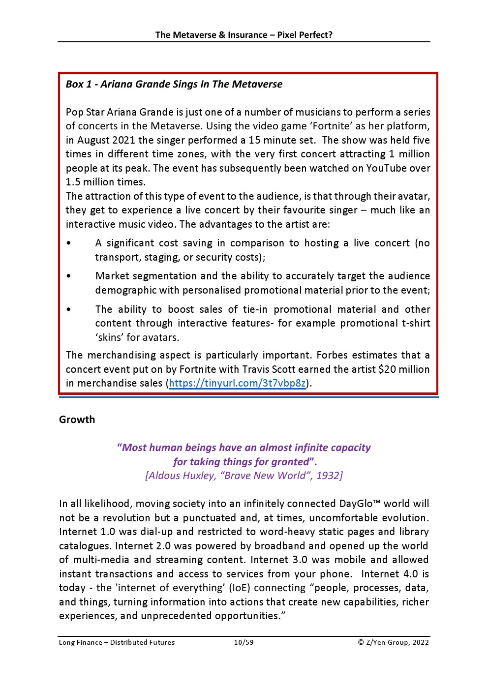 ZYEN发布了新报告“元宇宙与保险业”。“元宇宙”描述了相互关联、持久、共享的人造现实空间。 元宇宙包括有几个特征:超连接、以质取胜的外表和新的时空观念。它是一种进化技术,而不是一种革命性技术。元宇宙的普及将带来诸多挑战、风险和机遇。