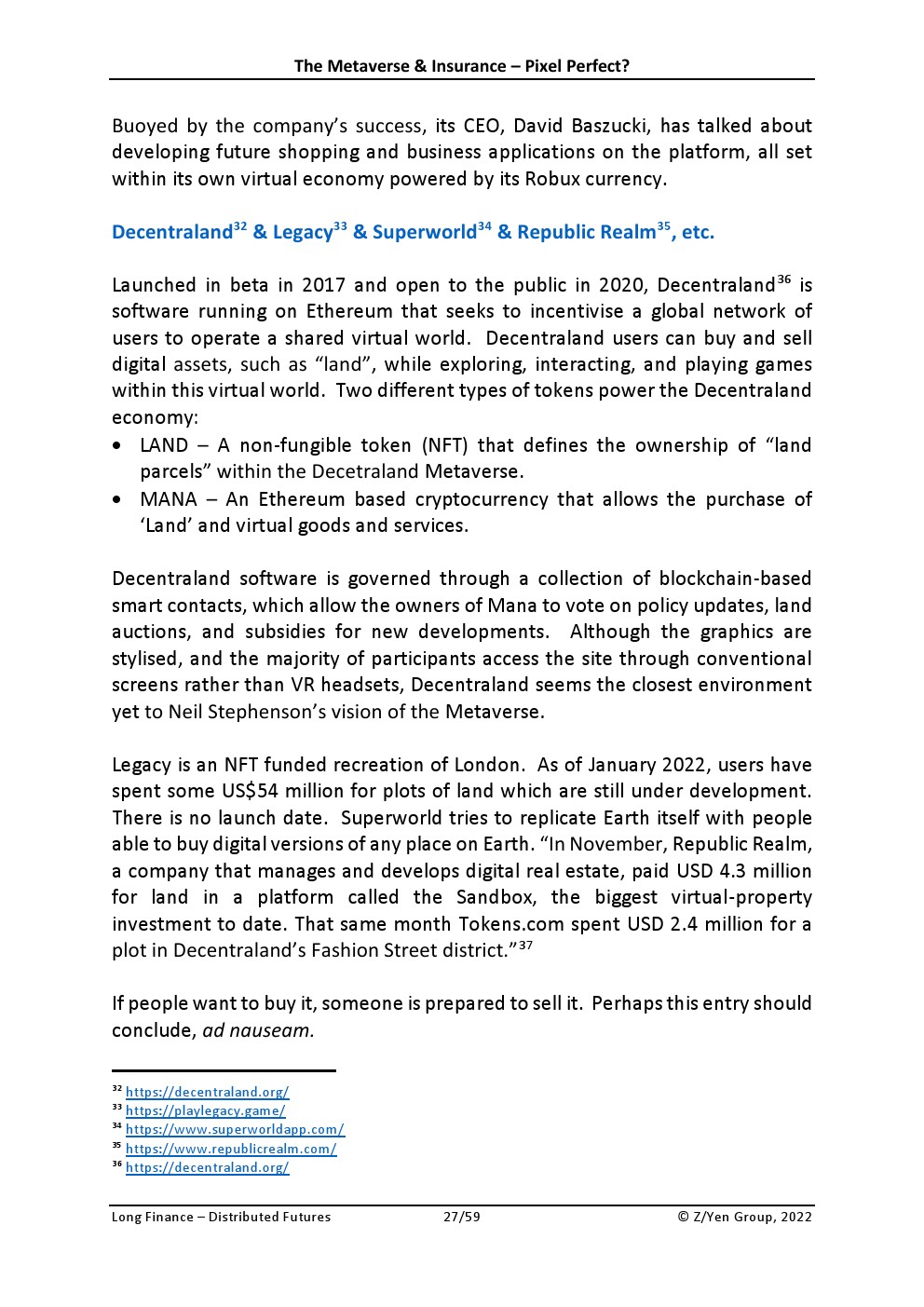 - 考虑新的筹资机制,特别是众筹。元宇宙如果实现了规模化,特别适合大量用户担保。例如,为特定在线资产提供保险的相关证券可以与用户的担保或用于创建风险管理投资组合的赌博市场相关联。