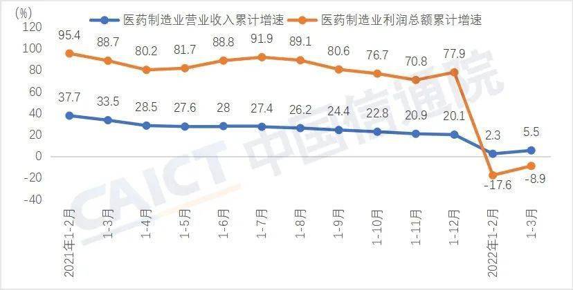 由于疫情防控带来的需求支撑,2022年一季度我国医药制造业增加值在去年高基数基础上保持两位数的快速增长,增速高于工业总体5.3个百分点。受新冠检测类、治疗药物类等企业效益拉动,3月份医药制造业利润总额增速由负转正增长12%,带动一季度降幅较前2个月收窄8.7个百分点。受国外防疫物资需求旺盛影响,一季度医药制造业出口交货值保持较快增长态势,同比增长14.5%。