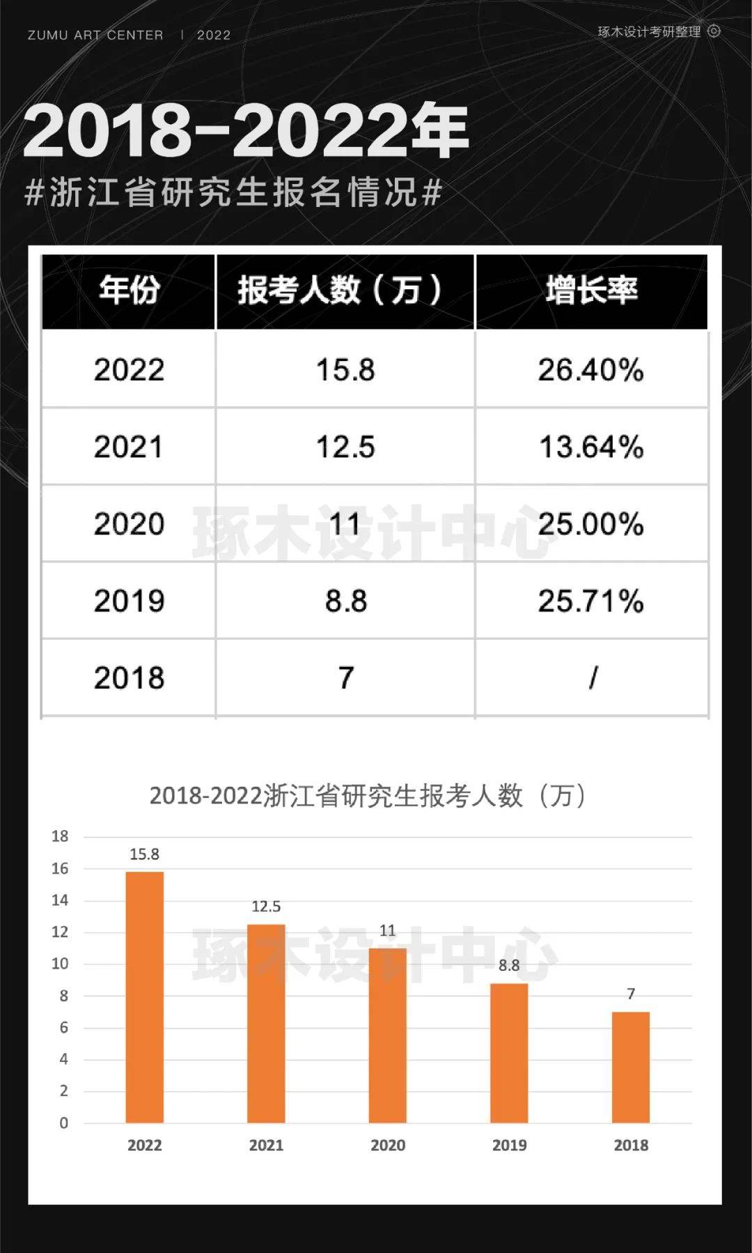 2022 年浙江省研究生报考人数达到历史新高,约 15.8 万人,2021 年报考人数约 12.5 万人, 增加了 3.3 万人,增幅为 26.4%。