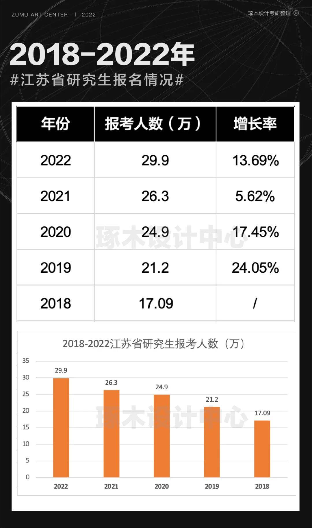 2022 年江苏省研究生报考人数约 29.9 万人,2021 年报考人数约 26.3 万人, 增加了 3.6 万人,增幅为 13.69%。