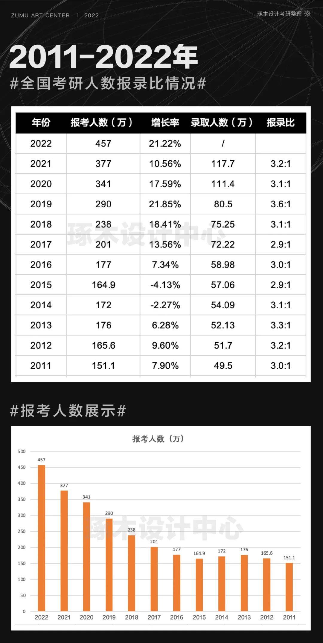2022 年全国硕士研究生报名人数 457 万,比 2021 年增长 80 万,增幅为 21%。从近年数据来看,2020 年考研报名人数比 2019 年增加了 51 万人,2021 年比 2020 年增加了 36 万人。自 2016 年起,我国硕士研究生报考人数在高位上保持高增长趋势。