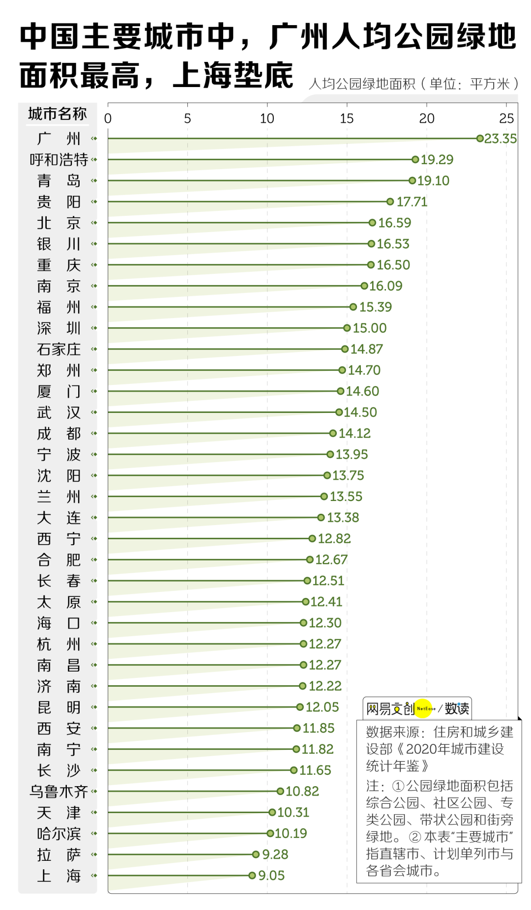 同样从人均面积来看,据住建部发布的《2020 年城市建设统计年鉴》,中国主要城市中,人均公园绿地面积最高的是广州,为 23.35 平方米 / 人 [4]。