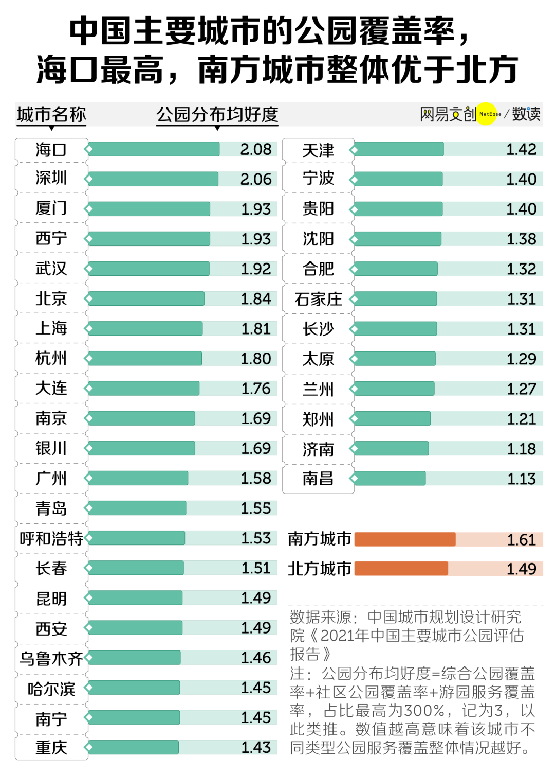 根据《2021 年中国主要城市公园评估报告》,中国主要城市中,公园分布均好度最高的是海口。海口的公园本就不多,尽量建在居住区也情有可原 [5]。