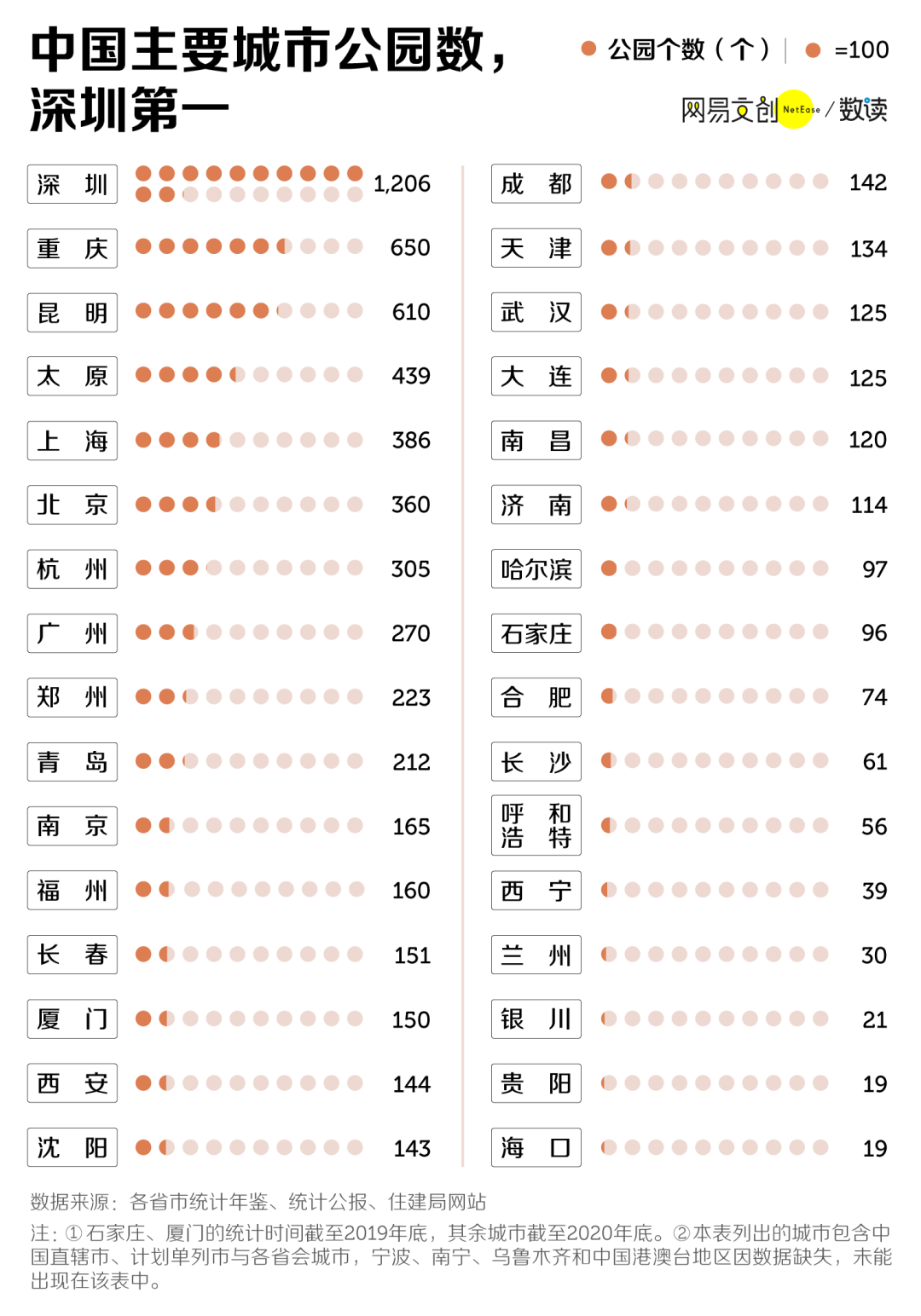 在中国主要城市,即直辖市、计划单列市和省会城市中,深圳的公园数超过其他所有一线城市,达到 1206 个,是不折不扣的 “千园之城”。
