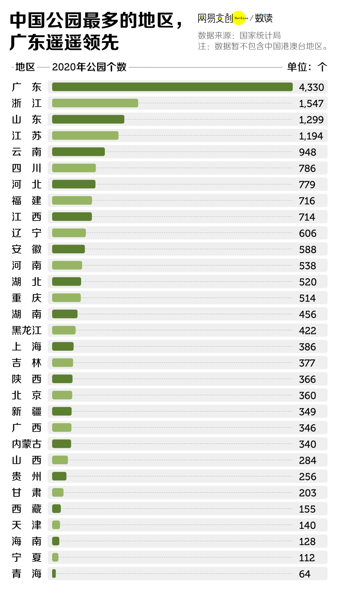 像青海就很难见到几家公园,全省 2020 年的公园数只有 64 个。青海有 8 个地级行政区,相当于每座城市或自治州平均仅有 8 个公园。