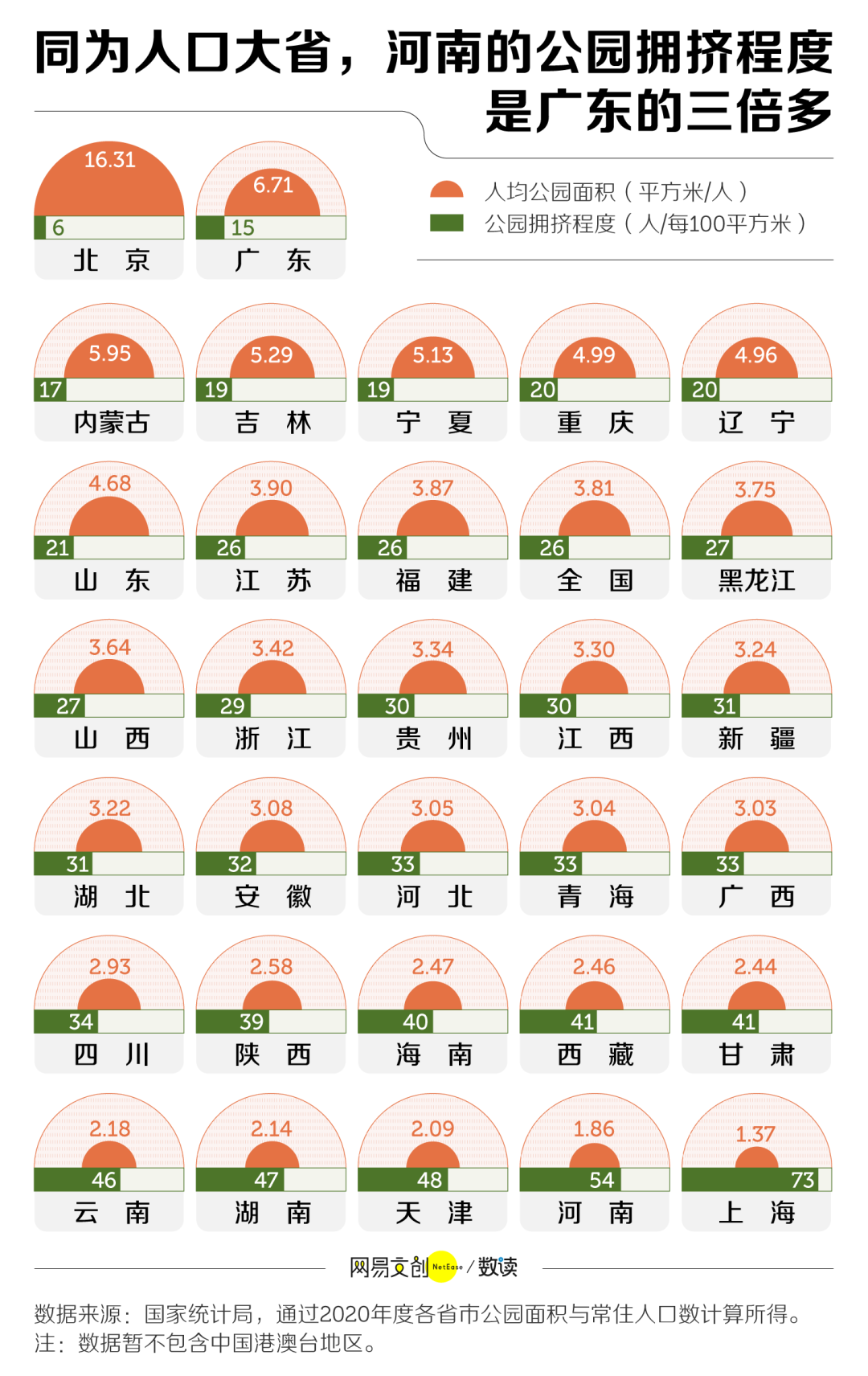 同为人口大省的河南,人们就要接受 “被平均” 的命运,人均公园面积仅有 1.86 平方米 / 人,相当于 100 平方米的房子里要挤上 54 个人。