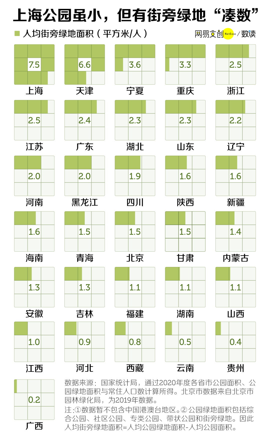 对比各大城市,上海的人均街旁绿地面积最大,为 7.5 平方米 / 人。