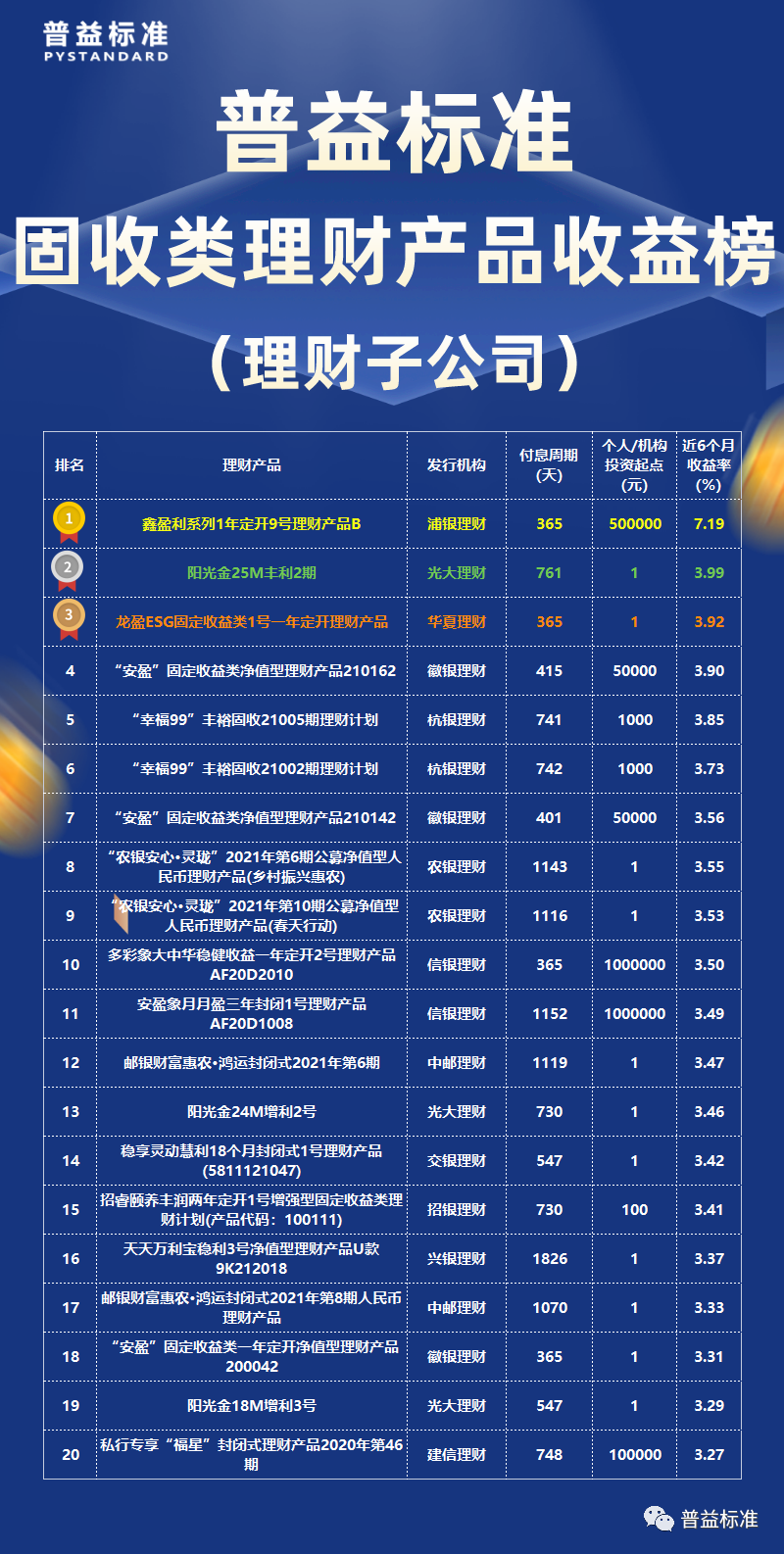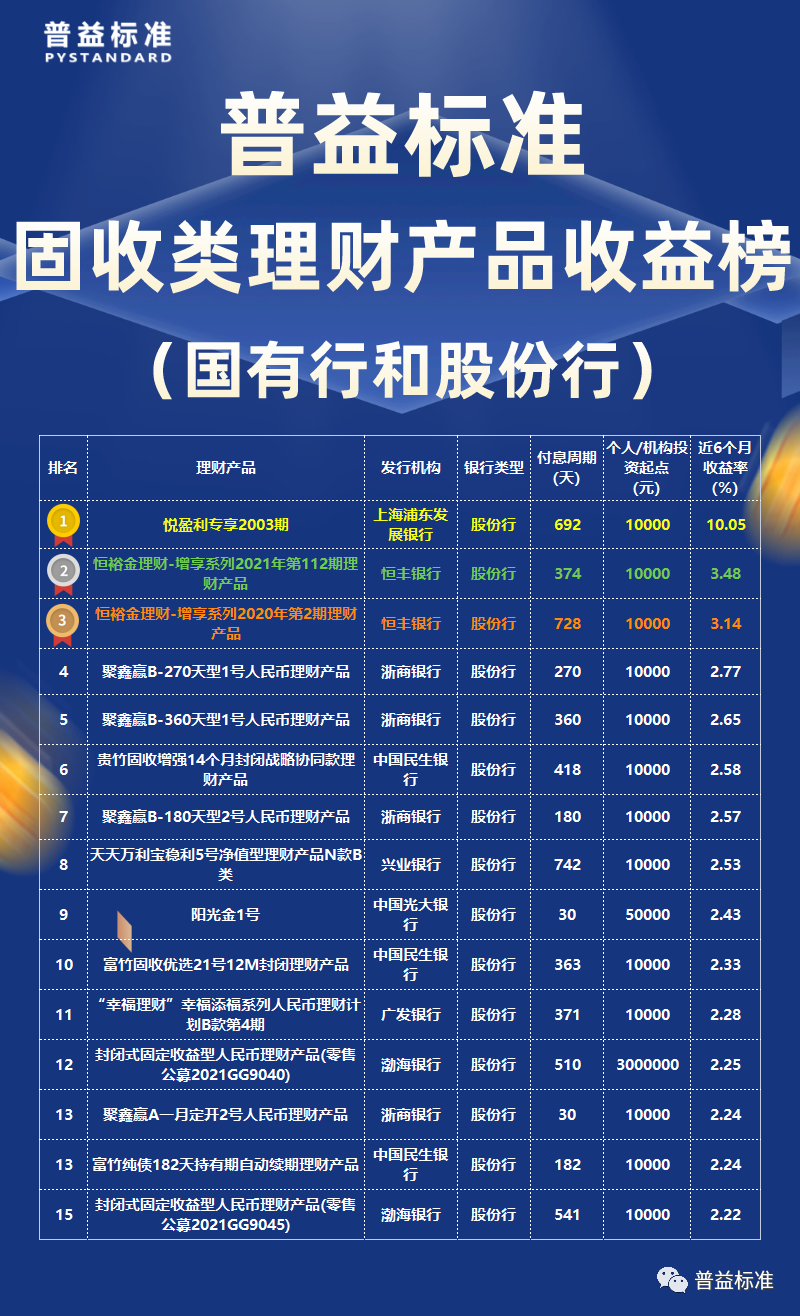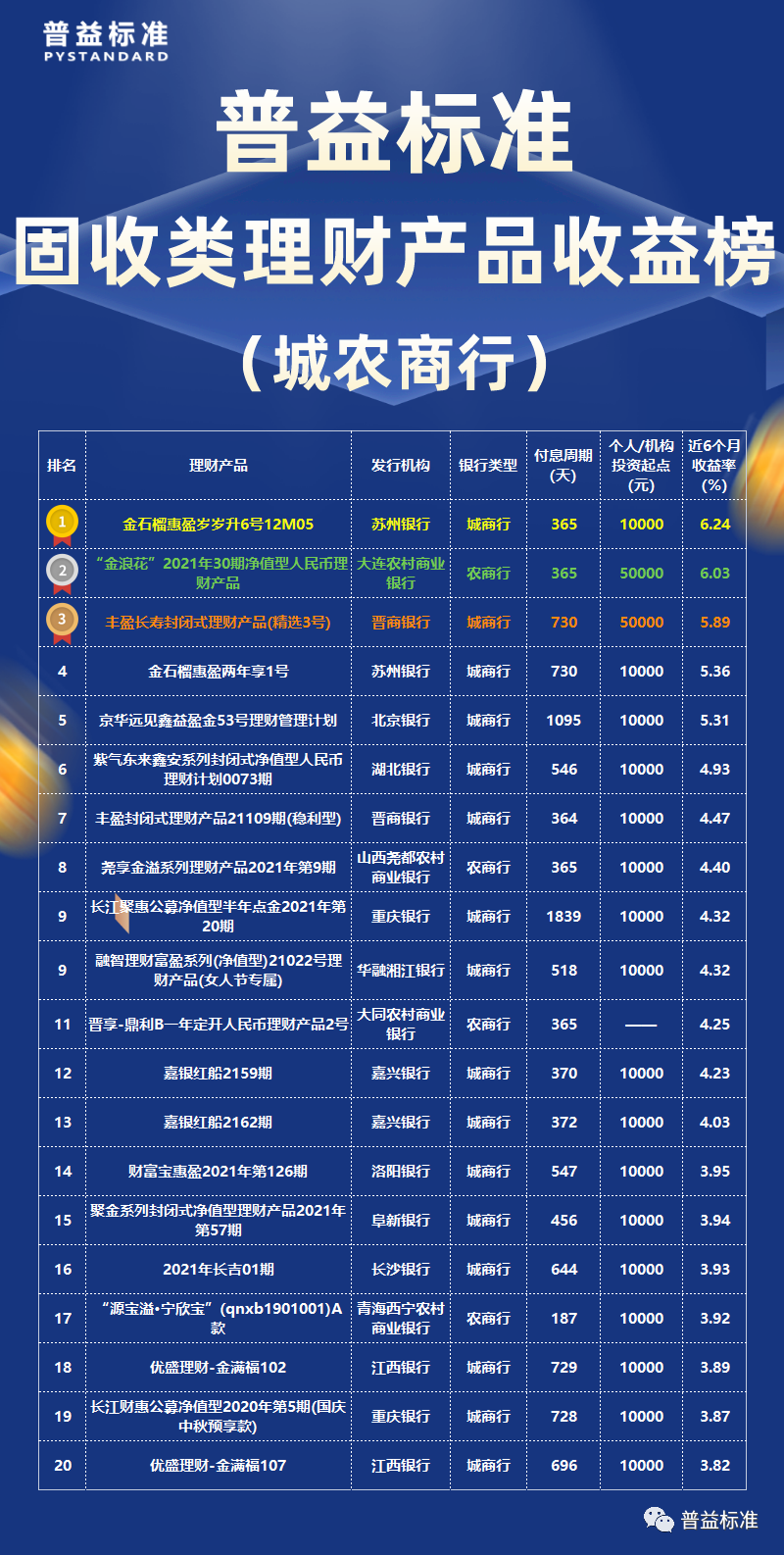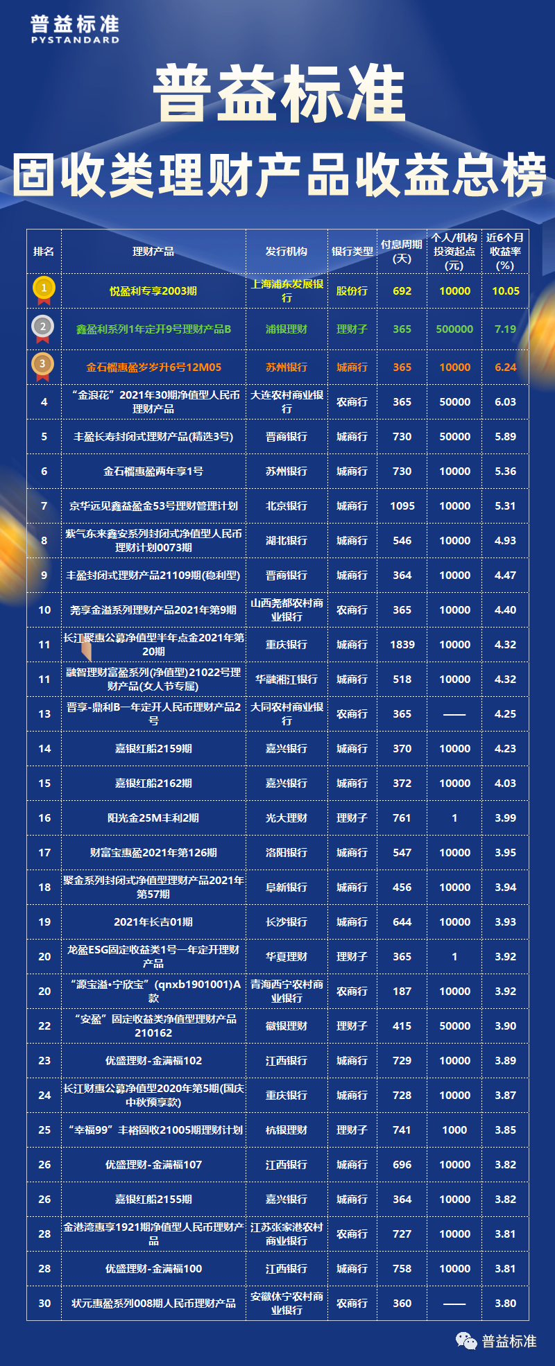 4月总榜中,城商行有18款产品上榜,农商行有6款产品上榜,理财子有5款产品上榜,股份行有1款产品上榜。其中,上海浦东发展银行的“悦盈利专享2003期”蝉联桂冠,其近六个月收益率约为10.05%;浦银理财的“鑫盈利系列1年定开9号理财产品B”和苏州银行的“金石榴惠盈岁岁升6号12M05”分别位居第二、第三位。此外,嘉兴银行和江西银行均有3款产品上榜,表现优异。 4月国有行和股份行固收类产品收益率排行榜中,上海浦东发展银行旗下“悦盈利专享2003期”的近六月收益率约为10.05%,蝉联第一;恒丰银行的“恒裕金理财–增享系列2021年第112期”和“恒裕金理财–增享系列2020年第2期理财产品”分别位居第二、第三位。本期榜单中,浙商银行共有4款产品上榜,引领本期分榜榜单。 4月城农商行固收类产品收益率排行榜中,苏州银行的“金石榴惠盈岁岁升6号12M05”排名第一,其近六月收益率约为6.24%;大连农村商业银行的“”金浪花“2021年30期净值型人民币理财产品”和晋商银行的“丰盈长寿封闭式理财产品(精选3号)”分别位居第二、第三位。本期榜单中,城商行共有16款产品上榜,优势明显。 4月理财子固收类产品收益率排行榜中,浦银理财的“鑫盈利系列1年定开9号理财产品B”摘得桂冠,其近六个月收益率约为7.19%;光大理财的“阳光金25M丰利2期”和华夏理财的“龙盈ESG固定收益类1号一年定开理财产品”分别位居第二、第三位。本期共有12家理财子上榜,其中多家理财子有2款以上产品上榜,竞争激烈。 详细榜单情况如下: 4月固收类理财产品收益率总榜 |