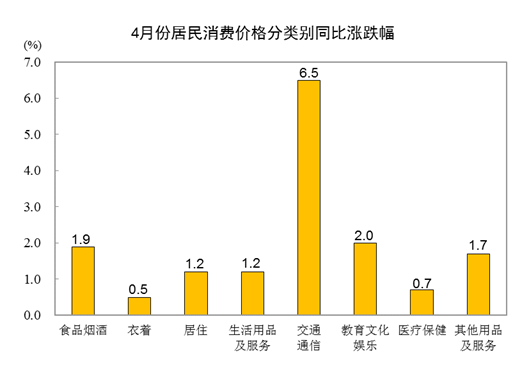 其他七大类价格同比均上涨。其中,交通通信、教育文化娱乐、其他用品及服务价格分别上涨 6.5%、2.0% 和 1.7%,居住、生活用品及服务价格均上涨 1.2%,医疗保健、衣着价格分别上涨 0.7% 和 0.5%。