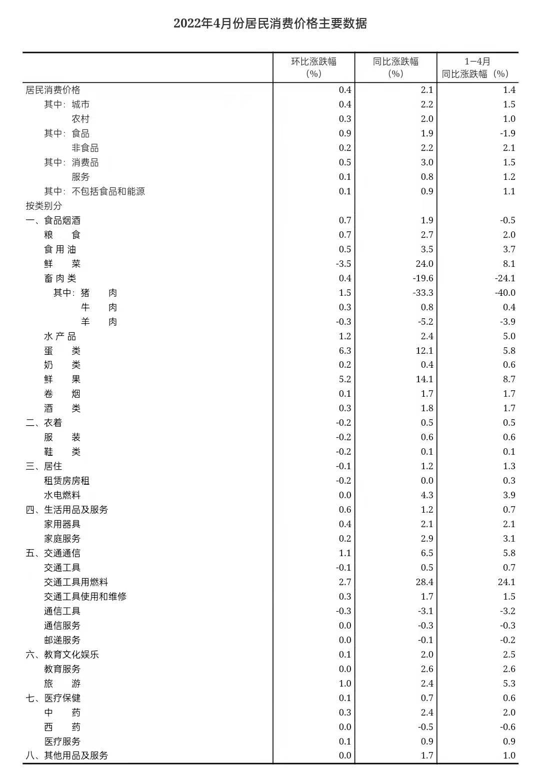 2022 年 4 月份,全国居民消费价格同比上涨 2.1%。其中,城市上涨 2.2%,农村上涨 2.0%;食品价格上涨 1.9%,非食品价格上涨 2.2%;消费品价格上涨 3.0%,服务价格上涨 0.8%。1—4 月平均,全国居民消费价格比上年同期上涨 1.4%。