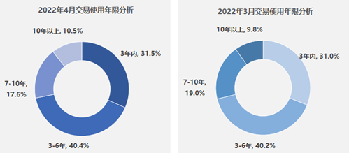 4月,二手车使用年限在3-6年的交易量最多,占比40.4%,环比增加了0.2个百分点,较去年同期增加了1.7个百分点;使用年限在3年内车型占比为31.5%,环比增加了0.5个百分点,较去年同期增加了9.9个百分点;车龄在7-10年的车型占17.6%,环比减少了1.4个百分点,较去年同期减少了6.9个百分点;车龄10年以上的车型占比为10.5%,环比增加了0.7个百分点,较去年同期减少了4.7个百分点。