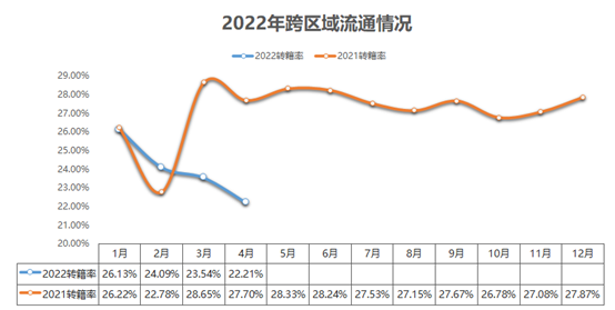 从数据上显示,多地防疫政策的升级对二手车的跨区域流通带来很大影响。4月二手车转籍比例为22.21 %,环比小幅下降1.3%,较去年同期下降了5.5个百分点。