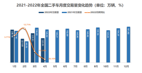 2022年4月,全国共交易二手车110.06万辆,环比下降16.51%,月度同比下降26.10%,交易金额为751.51亿元,同比下降16.48%,交易量低于市场预期。