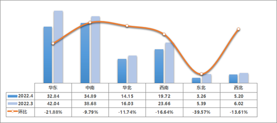 2022年4月,全国六大区环比均出现明显下降。其中下降最为明显的是东北地区,环比下降39.57%,二手车交易量为3.26万辆;其次是华东地区环比下降了21.88%,二手车交易量为32.84万辆;西南、西北和华北地区降幅超过10%,分别下降了16.64%、13.61%和11.74%,分别交易二手车19.72万辆、5.20万辆和14.15万辆;中南地区降幅相对较弱,共交易了34.89万辆,环比下降了9.79。