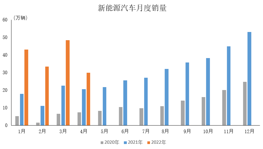 2022年1-4月,新能源汽车产销160.5万辆和155.6万辆,同比增长均为1.1倍,市场占有率达到20.2%。