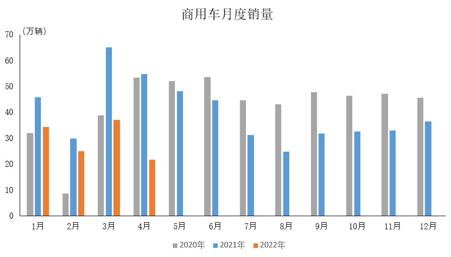 2022年4月,商用车产销分别完成21万辆和21.6万辆,环比下降41.8%和41.6%,同比下降59.8%和60.7%。