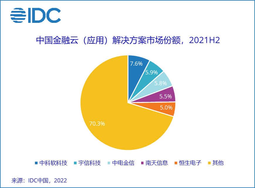 云应用方面,银行、保险、互联网金融、证券及其他投资等四类子市场均保持快速增长,金融机构普遍将分布式新核心、互联网银行核心、信贷系统、保险核心与销售支持、证券综合金融服务平台等系统构建或迭代在云计算架构之上,推动云应用市场增速维持在40%以上,中科软科技、宇信科技、中电金信、南天信息、恒生电子等,依然为本期云应用市场的核心玩家。
