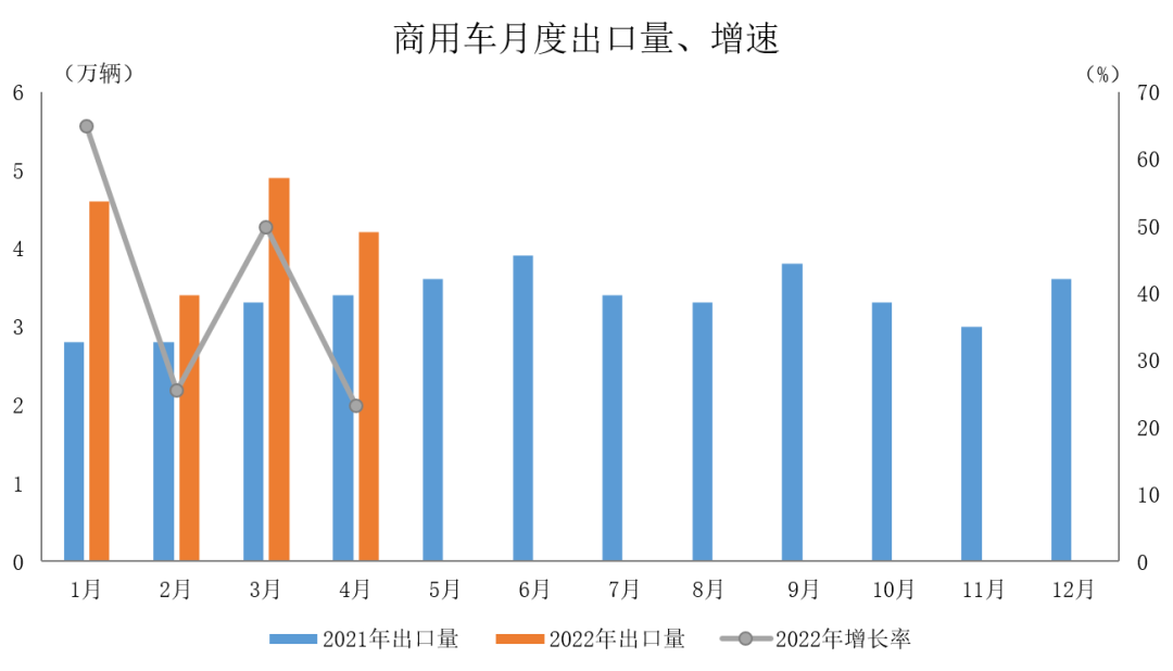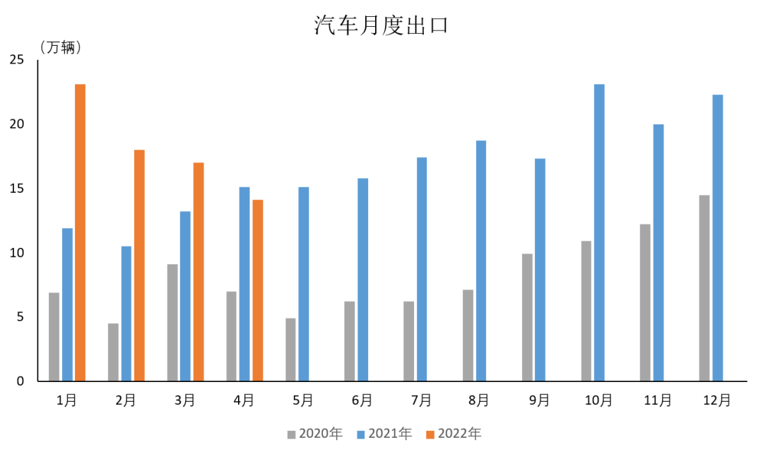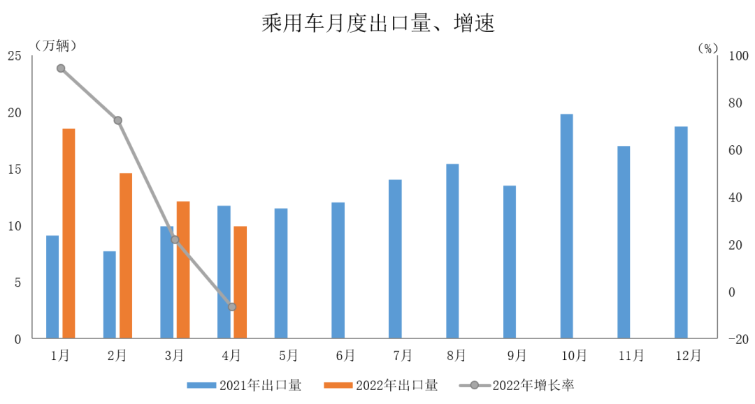 中国汽车工业协会: 2022年4月汽车出口情况简析 据中国汽车工业协会统计分析,2022年4月,汽车企业出口比上年同期略有回落。 2022年4月,汽车企业出口14.1万辆,环比下降17.2%,同比下降6.6%。 2022年1-4月,汽车企业出口72.3万辆,同比增长39.4%。 2022年4月,乘用车本月出口9.9万辆,环比下降18.1%,同比下降15.2%。 2022年1-4月,乘用车出口55.1万辆,同比增长39.1%。 2022年4月,商用车出口4.2万辆,环比下降14.8%,同比增长23.2%。 2022年1-4月,商用车出口17.3万辆,同比增长40.5%。 更多阅读:商务部:2020年1-5月我国汽车出口37.3万辆中国汽车流通协会:2022年1-3月中国汽车出口分析2025年1-9月中国汽车出口571万辆,同比增长21%乘联分会:2025年H1中国车型出口比亚迪宋PLUS销量13.4万辆 同比增长184%比亚迪:2025年1-5月出口37.42万辆,同比增长112%奇瑞汽车:2025年3月奇瑞共销售新车214770辆 同比增长18.3%中国汽车流通协会:2025年1-5月中国汽车出口对比分析中国汽车流通协会:2024年1-4月中国汽车出口市场分析中国汽车工业协会:2023年3月汽车出口情况简析中国汽车工业协会: 2023年2月汽车出口情况简析中国汽车流通协会:2022年1-8月中国汽车出口海外数据分析中国汽车工业协会:2022年8月汽车出口情况简析中国汽车流通协会:2022年1-7月中国汽车出口分析中国汽车流通协会:中国汽车出口海外数据分析中国汽车工业协会: 2022年5月汽车出口情况简析
