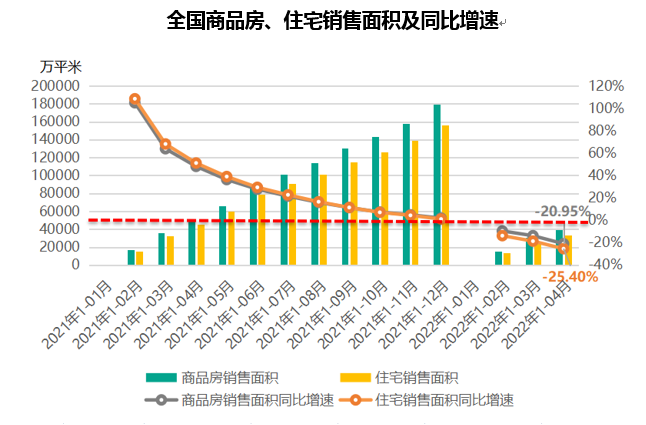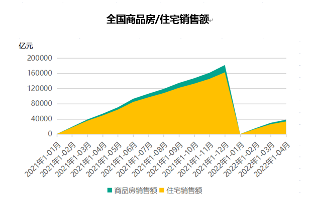 2022年 1-4 月,全国商品房销售面积 39768 万平米,同比下滑 20.95%,其中住宅销售面积占到 85% 为 33722 万平米,同比下滑 25.40%,连续三个月出现负增长。1-4 月商品房销售金额为 37789 亿元,同比降幅 29.51%,住宅销售金额为 33248 亿元,同比降幅 32.16%,均较上个月继续扩大。