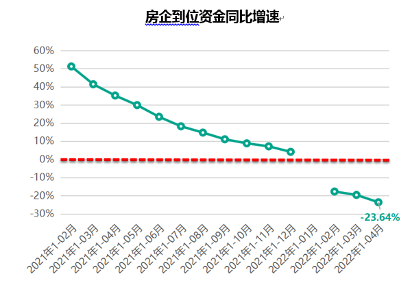 2022年 1-4 月,全国房企到位资金 4.9 万亿元,同比降幅 23.64%,较上个月继续扩大。从资金来源上看,国内贷款同比降幅 24.39%,定金及预收款同比降幅为 37%,个人按揭贷款同比降幅为 25%,都较上个月继续扩大,而仅利用外资情况同比增幅达 129%。