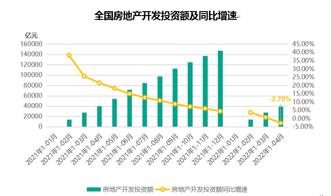 2022年 1-4 月,全国房地产开发投资额为 3.92 万亿元,同比增速为 – 2.70%,为 2020 年 6 月份以来的首次负值,并且自去年 2 月份以来房地产开发投资增速呈持续下滑态势。