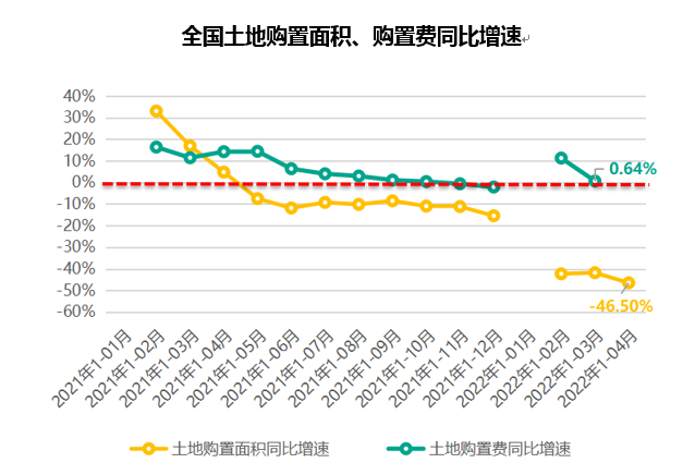 2022年 1-4 月份,全国土地购置面积仅为 1766 万平米,同比大幅下滑 46.5%,同比跌幅今年以来持续在 4 成以上,且下滑幅度再创新高。