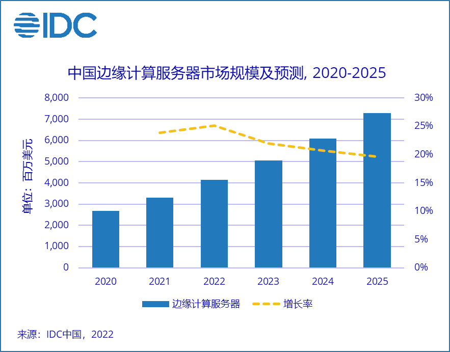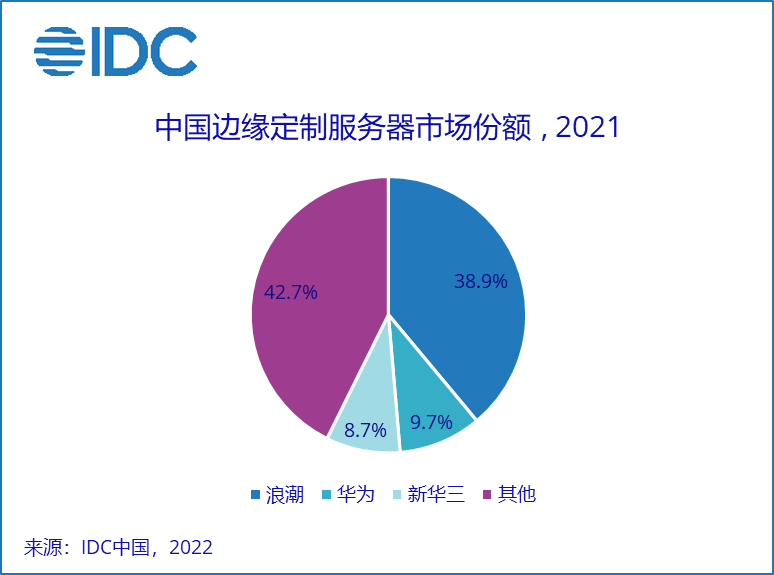 2021 年,中国垂直行业和电信网络边缘计算服务器(含通用服务器和定制服务器)市场维持了强劲的发展势头,市场规模进一步扩大到 4.8 亿美元,同比大幅增长 75.0%,5G 和 AI/ML 技术使能下的行业数字化转型需求是主要驱动力。从边缘定制服务器的出货规模来看,2021 年,中国市场排名前三的厂商依次为浪潮、华为和新华三。IDC 预计,随着靠近数据产生端的边缘应用场景逐渐丰富,对具有更紧凑的设备形态、低能耗特性、更宽的工作温度以及其他特点的边缘定制服务器需求将快速增加,以适应复杂多样的部署环境和业务需求,在 2021-2026 年,中国边缘定制服务器市场预计将保持 40.1% 的年复合增长率。