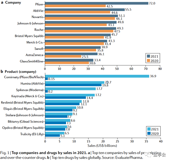 辉瑞和艾伯维的快速增长直接影响了诺华(Novartis)和罗氏(Roche)的排名,相比2020年的排名分别下滑了两位和三位。两家公司都没有新冠相关的明星产品,同时疫情导致罗氏中枢神经领域的大单品奥美珠单抗(Ocrevus)的销售额不及预期,同时另一畅销药物贝伐珠单抗(Avastin)也受到了生物仿制药所带来的影响。另一方面,诺华去年出售了其在罗氏 33% 的股份而获得了207亿美元,这将支持其通过收购快速扩充管线。
