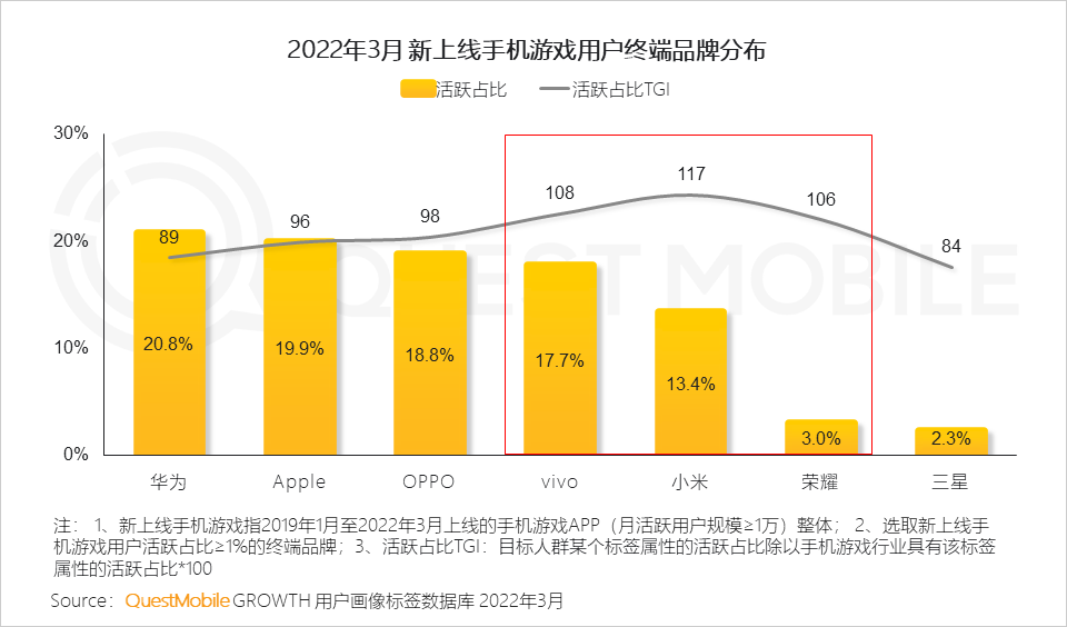 1.8 华为、苹果等为新上线游戏用户的主要终端品牌;通过赞助电竞赛事、针对性研发游戏手机等策略,vivo、小米及荣耀等品牌获得该群体的偏好